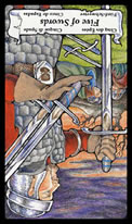 Als de zwaarden vijf omgekeerd valt dan is het tijd om je verlies te nemen. Je gelijk halen is niet hetzelfde als gelijk hebben. Je zit fout en je weet het. Op dit punt heb je al verloren, het maakt echt niet uit wat je nog meer zegt of doet. Trots en jaloezie houden je nog overeind, maar het wordt tijd om je nederlaag te accepteren en weg te lopen. Accepteren, leren en opnieuw starten.