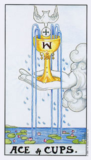Rechtop: Bekers Aas wijst op de start van een nieuwe periode vol liefde, vriendschap en creativiteit. Je bruist nu van de ideeën en gevoelens en je ziet vele nieuwe mogelijkheden. Deze impulsen komen van diep uit jezelf en doorstromen je gehele wezen met een positieve energie. Je bent daardoor ontvankelijk voor een nieuwe relatie, nieuwe artistieke projecten, misschien zelfs de creatie van een nieuw leven. Luister nu naar je intuïtie en laat je meestromen op je diepste gevoelens. De tarotkaart bekers aas schept de ideale voorwaarden voor liefdevolle, wederzijdse relaties.