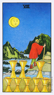 De rode kleding en laarzen geven aan, dat hij bewust alles achter zich laat en getuigen van moed en wilskracht. Hij doet dit niet zozeer uit onvrede, doch uit het weten, dat er meer is. Wat tot dusver waardevol voor hem was, is thans niet meer toereikend. Hij keert de acht bokalen de rug toe.