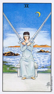 Een geblinddoekte vrouw zit op een stenen bank met de rug naar de zee gekeerd. Haar armen zijn gekruist. Ze heeft een zwaard in elke hand. Aan de hemel staat de maansikkel in het eerste kwartier. Deze vrouw trekt zich terug in zichzelf en is daartoe geblinddoekt. Het afwegen van de mogelijkheden en de dualiteit worden door de twee zwaarden weergegeven.