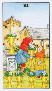 Rechtop: Je blikt terug op gelukkige herinneringen. Een tijd dat alles eenvoudig was en je jezelf kon verliezen in de schoonheid van eenvoudige dingen. Door deze prettige herinneringen komen oude idealen bovendrijven en vind je opnieuw inspiratie in zaken waarvan je dacht dat ze reeds lang in het verleden begraven lagen. Deze kaart wijst ook op een herstel van de familie harmonie na een periode van strubbelingen en hereniging of een thuiskomst. In zijn simpelste vorm staat deze kaart voor het creeëren en koesteren van een prettige sfeer in je thuissituatie, bijvoorbeeld door het kopen van een bloemetje of een lekker etentje met het gezin. Valt bekers zes naast een reiskaart  zoals zwaarden zes of staven acht, dan staat dit voor “naar huis gaan” of zal je de thuisreis aanvaarden.